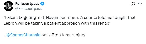 北京時間10月16日,湖人核心球星詹姆斯正在養(yǎng)傷,究竟他何時才能復(fù)出?據(jù)ESPN名記Shams報道,湖人計劃讓詹姆斯11月中旬復(fù)出,一位消息人士稱,詹姆斯將耐心進行傷病恢復(fù);詹姆斯傷停,湖人又添傷病,范德比爾特意外受傷退賽。