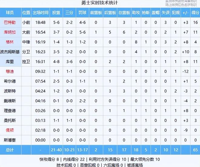 巴特勒16分3板1助、庫(kù)明加11分6板2助、庫(kù)里11分2板1助、波杰姆斯基8分4助、希爾德5分2板1助、格林4分8助、穆迪3分、桑托斯3分、波斯特2分3板、戴維斯2分、理查德1板1助