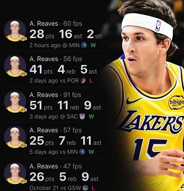 新賽季至今,里夫斯累計得到171分50助攻,成為湖人史上第一位在賽季前五場比賽中至少得到150分50助攻的球員。