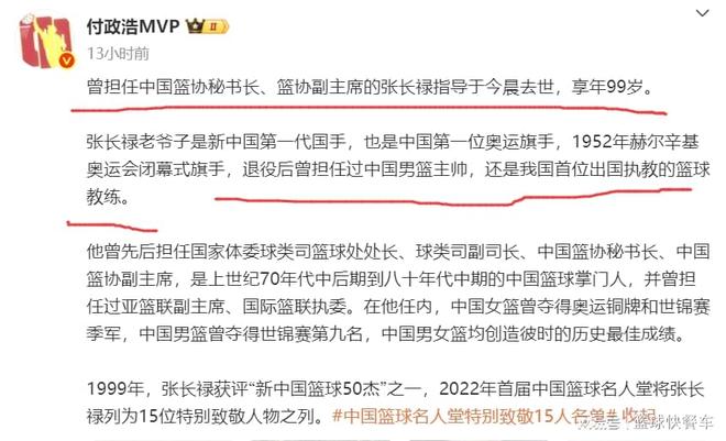 而根據(jù)知情人士透露,這位為中國籃壇貢獻一生的男籃名宿,他已經(jīng)永遠的離開了。據(jù)悉,張長祿在北京時間11月28日凌晨去世,享年99歲。事實上,對于這位德高望重的老爺子,早在1999年,中國籃協(xié)便將他評選為新中國籃球50杰之一。而在2022年首屆籃球名人堂,張長祿便被列為是15位特別致敬的人??梢哉f,老爺子幾乎將畢生貢獻給了籃球,也為中國籃球的發(fā)展做出了積極的貢獻。